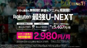 2025年10月1日から1月31日までの4か月限定で、楽天モバイルの「最強プラン」と人気ストリーミングサービス U-NEXT がセットで 2,980円(税込3,278円) になる、驚きのスタートキャンペーンが発表されました📱💻✨