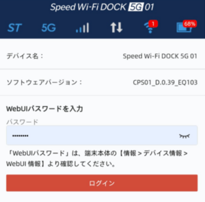 ルーター画面「情報」→「デバイス情報」→「WebUI情報」→「WebUIパスワード」で確認でき、これを入力すると設定画面にログインできます。