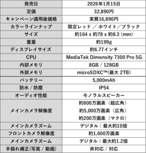 CPUにはMediaTek Dimensity 7300 Pro 5Gを搭載し、RAM8GB・ROM128GBという構成になっています。さらに最大2TBまで対応するmicroSDカードを利用できるため、写真や動画を多く保存したい方でも容量不足に悩まされにくい設計です。