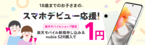 【Shop限定】端末割引クーポンキャンペーンは、18歳以下のお子様を対象に、楽天モバイルショップで新規回線契約を行うことで、大人気スマホ「nubia S2R」を1円で購入できる非常にお得な内容です。この端末は2025年12月発売の最新モデルで、性能・安全性・使いやすさを兼ね備えています。