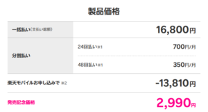 本体価格は16,800円ですが、「Rakutenオリジナル製品 特価キャンペーン」適用で13,810円割引となり、なんと2,990円で購入可能です✨