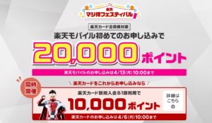 最後に紹介するのが、楽天モバイルの大型キャンペーン「楽天マジ得フェスティバル」です。これは楽天カードと楽天モバイルのコラボキャンペーンで、楽天ポイントが大量にもらえることで有名なイベントです。