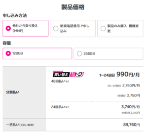 しかし定価を見ると「ちょっと高いな…」と感じる方も多いのではないでしょうか?実際、楽天モバイルでそのまま購入すると128GBモデルは定価89,760円、従業員紹介キャンペーンのポイントバックを含めても実質75,760円と、決して安いとは言えません。