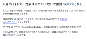 さらに4月27日までの期間限定で10,000ポイント還元キャンペーンが実施されています🎉ワイヤレスイヤホン Google Pixel Buds 2a(通常 23,800 円)が同時購入で 50% オフといずれかを選択できるので、ワイヤレスイヤホンを購入する場合は、こちらのほうが割引額はお得です。